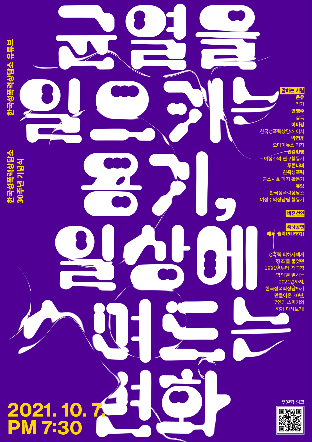 상담소에서는 올해로 개소 30주년을 맞이하여 성폭력 없는 세상을 만들기 위해 유튜브로 기념식을 준비했습니다. 상담소의 순간들을 7인의 말하기로 풀어내고 “균열을 일으키는 용기, 일상에 스며드는 변화”로 비전선언을 하며 래퍼 슬릭의 축하공연까지 마련하였습니다.