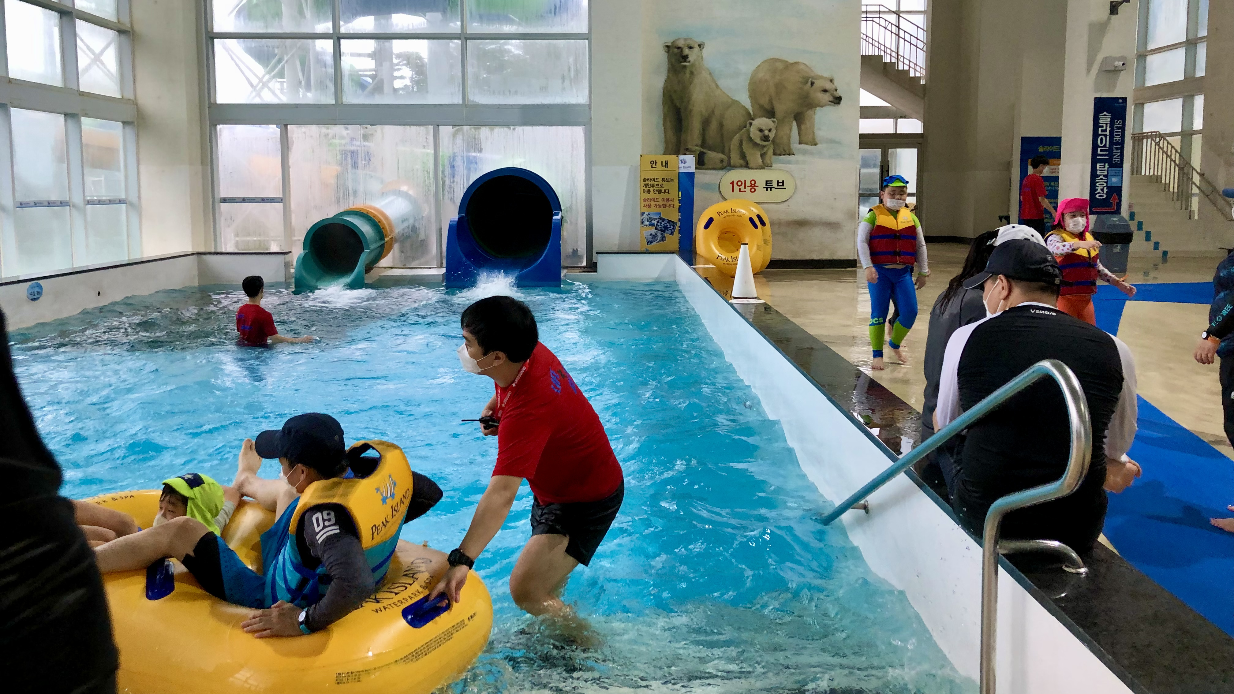 버스에서 내린후 우리는(열림터 활동가,활동인들) 캐리어 짐을 다 가지고 터덜터덜 수영장을 갔다. 리조트 수영장은 내가 전에 가본 수영장하고 크게 다르지는 않았다. 수영장에서 A랑 같이 둘이 다니다 흡연실을 가고 워퍼 슬라이드도 타고 이것 저것 하다 배가 곱아서 선생님들 있는 분식집으로 갔다. 그 분식 집에서 오뎅,치킨볼,쏘떡쏘떡,회오리 감자를 먹었다. 그 분식 집은 쏘떡쏘떡 맛집인게 맞는거 같다.
