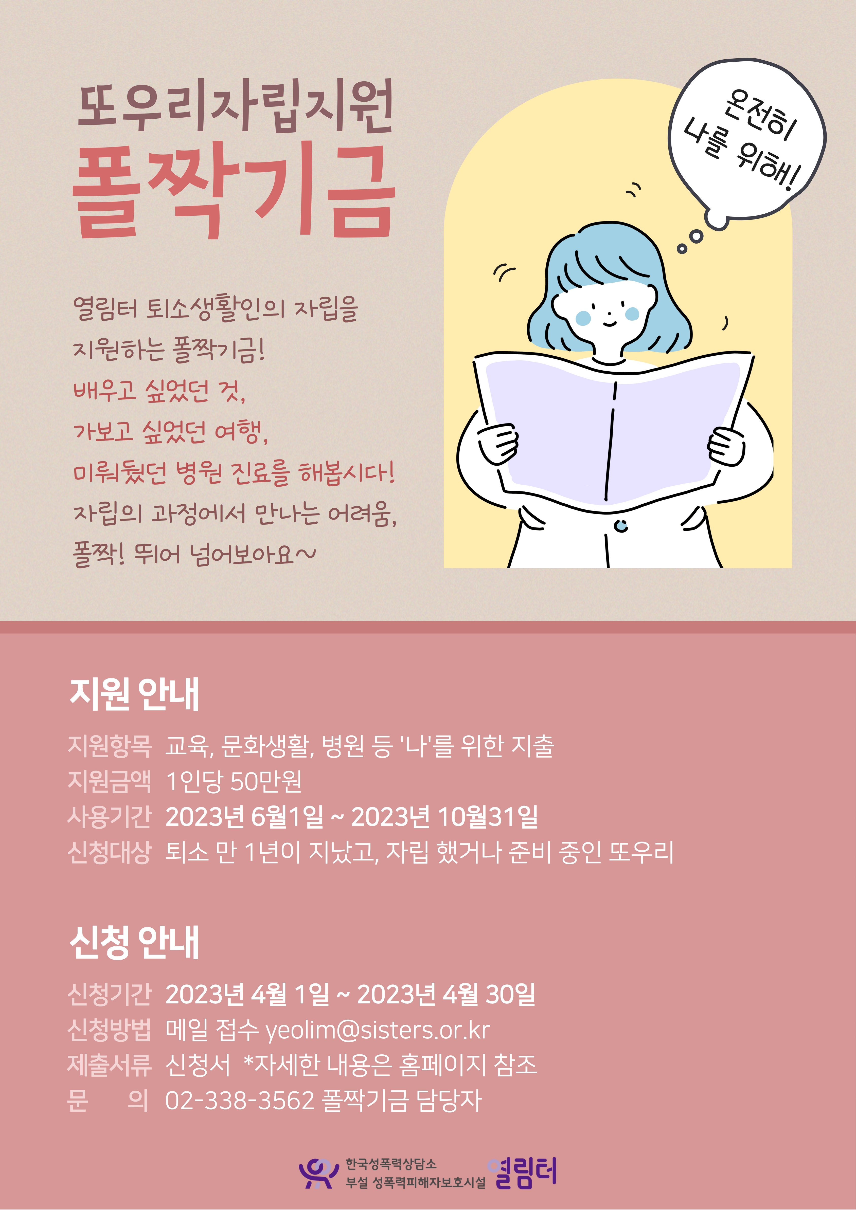 | 지원내용: 교육, 여행, 문화생활, 병원, 운동 등등 ‘나’를 위한 지출 지원금액: 50만 원 지원대상: 열림터를 퇴소한 지 1년이 지난 사람. 자립했거나 자립을 준비하는 사람 * 1회 지원 선정 시 다음 해 지원대상에서 제외 (2022년 폴짝기금 사용자는 신청 불가능) * 퇴소 후 2회까지 지원 가능 |