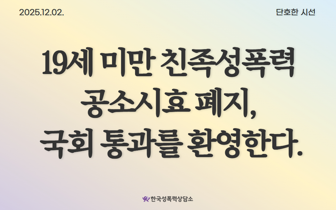 국회 본회의는 2025년 12월 2일, 친족에 의한 아동·청소년 대상 성폭력 공소시효를 폐지하는 법안(의안번호 2214190호)을 통과시켰다. 이 법은 정부 이송을 거쳐 공포한 날로부터 즉시 시행되며, 시행 이후부터 만 19세 미만의 친족성폭력 피해자는 공소시효를 적용받지 않는다. 또한 아직 공소시효가 완성되지 않은 사건에도 동일하게 적용된다. 한국성폭력상담소는 가족 내 성폭력에 대한 구조적 해법으로서 ‘친족성폭력 공소시효 폐지’ 법안의 통과를 진심으로 환영한다.