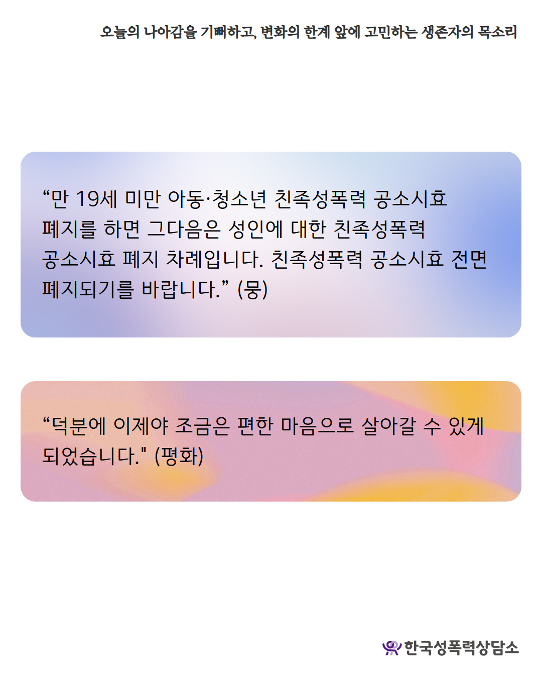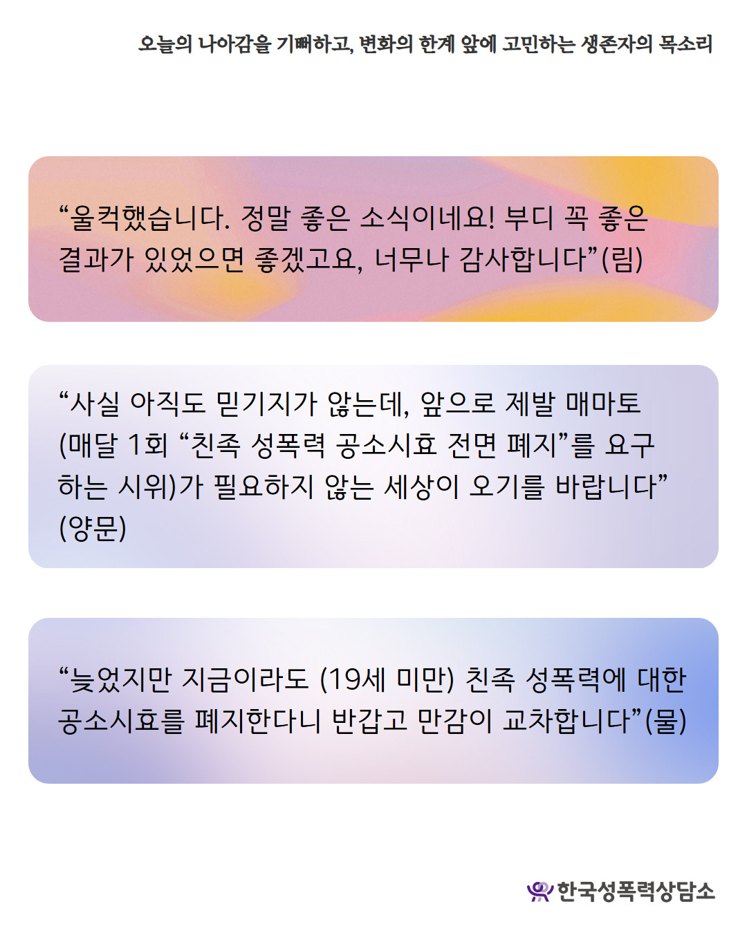 “늦었지만 지금이라도 (19세 미만) 친족 성폭력에 대한 공소시효를 폐지한다니 반갑고 만감이 교차합니다”(물)