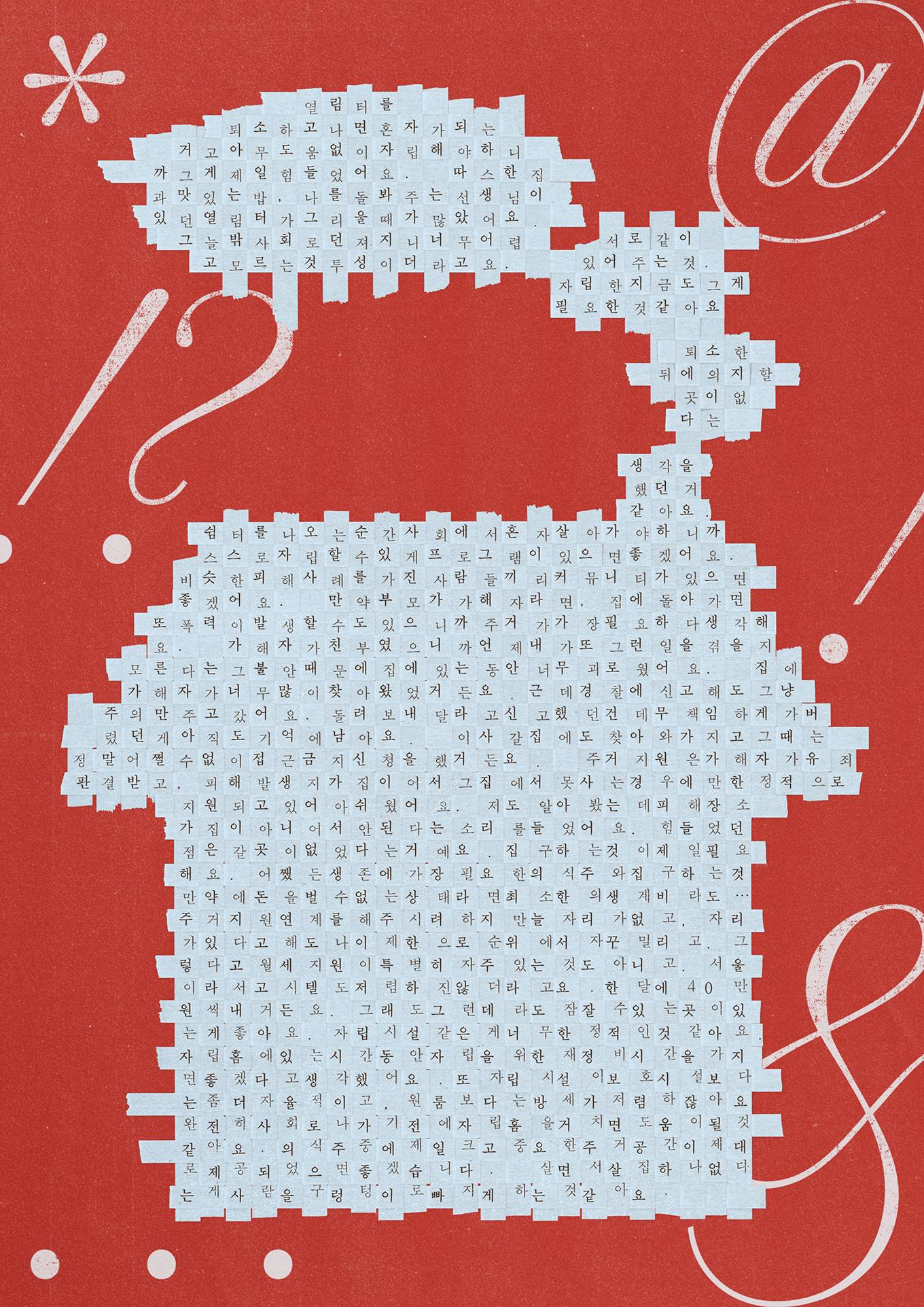 그러나 이같은 집은 성폭력피해생존자에게 쉽게 허락되지 않습니다. 방을 구한다고 해도 혼자 살아본 경험이 없고, 경제적 여력도 없기에 주거환경이 열악하기 일쑤입니다. 옆집과 너무 가까워 사생활이 보장되지 않기도 하고요. 창문이 없거나 환기가 되지 않아 곰팡이와 씨름을 해야하기도 합니다. 집은 어떻게 구하긴 했는데 가구와 집기들을 마련할 여력이 없기도 합니다. 공과금을 본인이 직접 내본 경험이 없어 오래 내지 않다가 전기가 끊어질 지경이 되기도 합니다. 건강보험도 스스로 내야 한다는 사실을 새롭게 알게 됩니다. 혼자 살면서 비로소 ‘진짜 홀로서기’를 배웁니다.