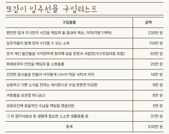 1월 한달 간 모금함을 통해 총 34명의 후원자가 180만원의 후원금을 보내주셨고, 모금함이 오픈하기도 전에 또같이 소식을 접한 후원자분들이 보내주신 350만원의 후원금을 포함하여 총 530만원의 후원금이 모였습니다. 많은 분들의 소중한 후원금은 다음의 가구와 물품을 구입하는데 사용하였습니다.